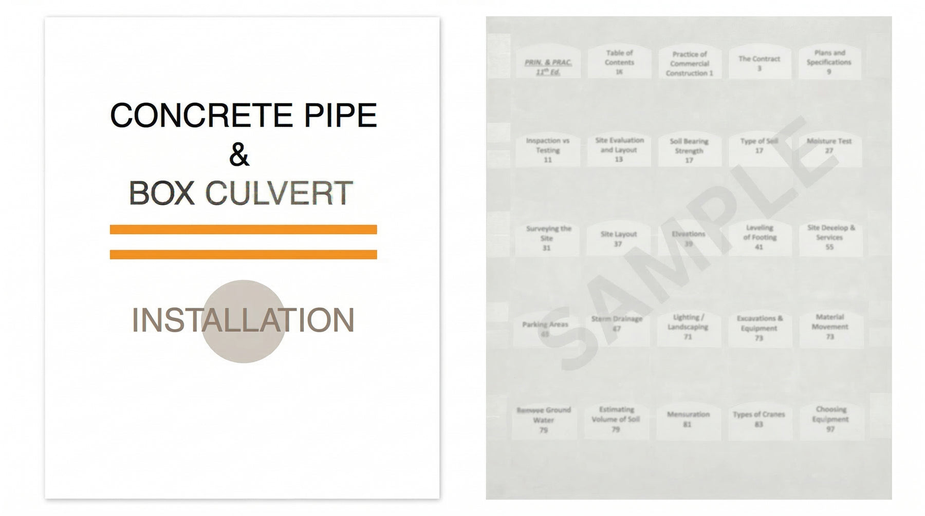 This manual presents a guide for the proper installation of concrete pipe. For many years, the American Concrete Pipe Association has conducted comprehensive research and analysis of the factors which affect the field performance of concrete pipe. The knowledge and beneficial practices gained through research and experience are presented in this manual. With the development of national standards for design and manufacturing, box culverts are rapidly becoming a large part of the precast industry. One of the unique benefits of precast concrete boxes is their fast and easy installation, even under adverse field and weather conditions. Precast boxes, like concrete pipe, can be custom fabricated to any configuration needed or desired in the field. Where larger waterway capacity is required, multiple sections can be placed side-by-side or connected in rows to provide an excellent storm water detention system for areas with outfall flow restrictions or requirements for on-site detention.